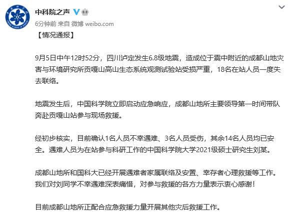 地震发生后,中国科学院立即启动应急响应,成都山地所主要领导第一时间带队奔赴贡嘎山站参与现场救援。经初步核实,目前确认1名人员不幸遇难、3名人员受伤,其余14名人员均已安全。遇难人员为在站参与科研工作的中国科学院大学2021级硕士研究生刘某。