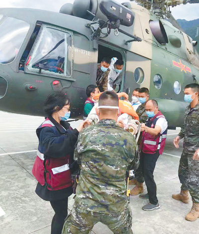 9月6日,在四川省泸定县泸桥镇,四川省人民医院赴泸定医疗队医务人员正接诊直升机转运出来的伤员。