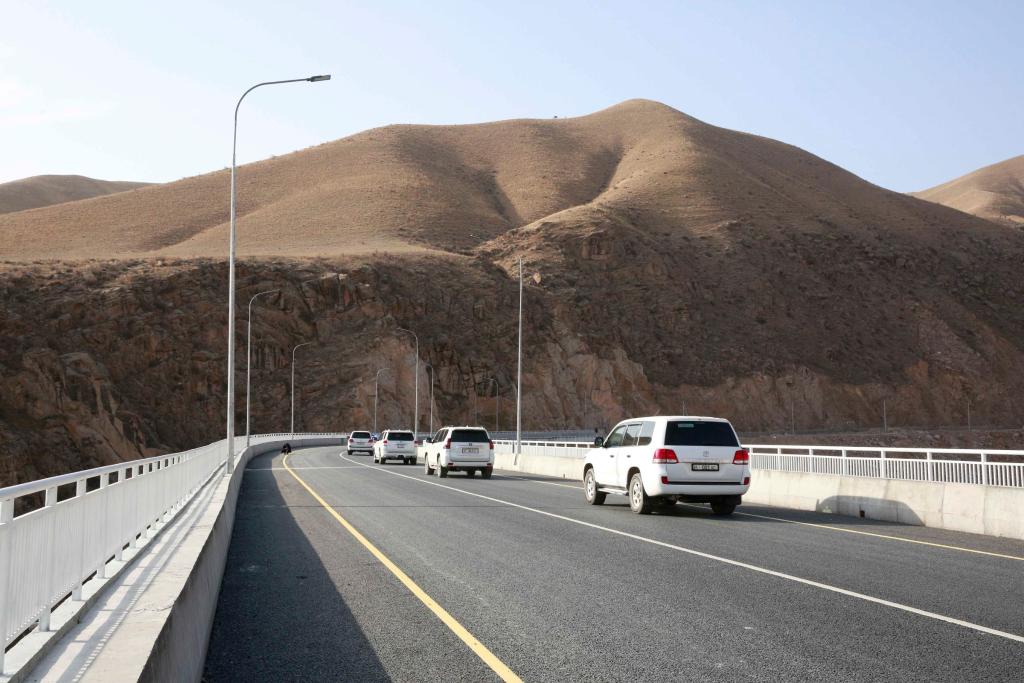 2021年11月10日,汽车行驶在吉尔吉斯斯坦新北南公路二期工程的一座大桥上。新华社发(罗曼摄)