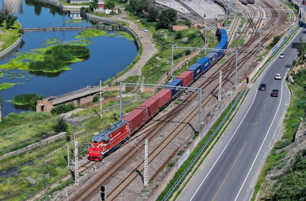8月29日,首趟中欧(中亚)班列“京张号”从张家口市下花园铁路货运中心场区启程(无人机照片)。新华社发(武殿森摄)