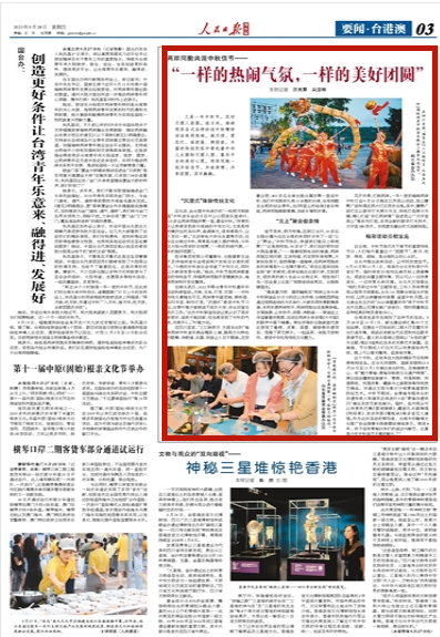 在北京,由台盟中央举办的“一轮明月照家国”中秋音乐会近日在中山公园音乐堂举行,500多名两岸同胞欢聚一堂,喜迎中秋。“欣赏民乐让我感受到其中流淌的中华文化,尤其是唢呐模仿出的鸟叫声,曲调高亢,很有感染力,让人耳目一新。”北京邮电大学台生黄隽杰说,往年在台湾过中秋,常常是与家人围炉烤肉,今年在大陆与同学好友相聚,“一样的热闹气氛,一样的美好团圆”。