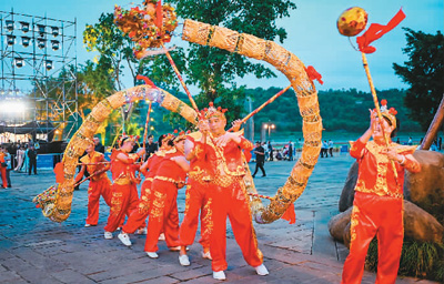 在四川宜宾,演员在“三江映明月 天涯共此时”海峡两岸中秋音乐晚会上舞草龙迎佳节。