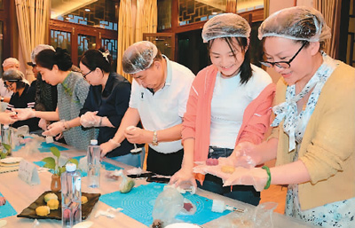 “清泉邀月明 碧荷融桃实”两岸山东乡亲中秋联谊会上,台胞台属相聚一堂,体验月饼制作。