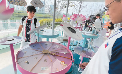 运动员村里人气最火的场所之一,当属徽章交换中心。形似荷叶的旋转托盘内,有多种徽章待选,只需拿出一枚徽章放到机器装置上,就可以交换到另外一枚徽章。工作人员告诉记者,有的外国运动员来过好几次,就是想再多换几枚样式更好看的徽章。