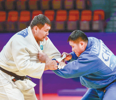 9月27日,柔道项目混合团体铜牌争夺赛,中国代表团选手李瑞轩(右)在比赛中。本报记者 张武军摄