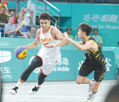 9月27日,三人篮球男子循环赛,中国代表团选手周彦旭(左)在比赛中。本报记者 蒋雨师摄