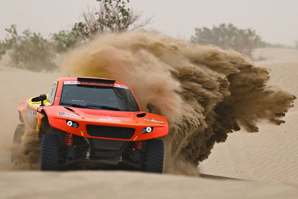 2025年5月31日,极道体育黑熊轮胎车队车手赵善鹏、领航员郭峰在比赛中。新华社记者 辛悦卫 摄