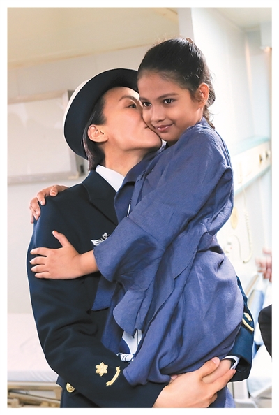 在中国海军和平方舟号医院船上,医生盛睿芳亲吻孟加拉国的9岁女孩沁。吴炜权摄(新华社发)