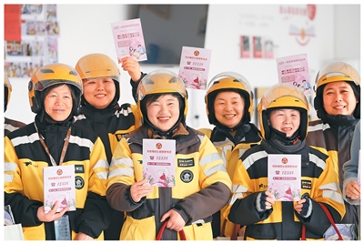 在山东省临沂市郯城县郯城街道龙泉社区,外卖女骑手展示妇联发放的妇女维权公益服务知识手册。张春雷摄(新华社发)