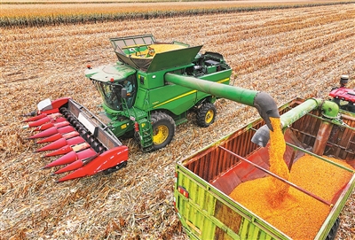 目前,内蒙古通辽市今年种植的近2000万亩玉米收获已过半,田间地头一派忙碌景象。图为通辽市科尔沁区敖力布皋镇,农机手驾驶收割机把玉米装入卡车。