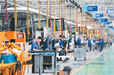 中国扬州亚星客车公司生产的纯电动公交车配有驾驶辅助系统和无障碍设施。该车型已在新加坡、日本等国及拉美地区投放。图为五月二十二日,工人在位于江苏省扬州市的亚星客车总装车间内作业。新华社记者 李博摄