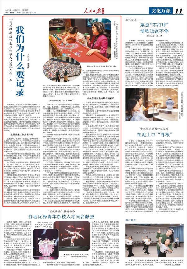 “如果要为非遗记录工作做一个比喻,‘眼睛’或许是最恰当的。我们所做的一切,正如一双双看向历史、现在与未来的眼睛。”田苗说,“非物质文化遗产传承人从祖先那里继承的智慧与历史,今人同样有责任将之原原本本地记录下来,留给后代和未来。”(本报记者 黄敬惟)