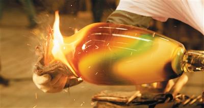 日前,记者走进山东省淄博市博山区爱美琉璃公司的大炉车间,只见1400℃的炉火吞吐着热浪,琉璃原料在高温中熔成赤红浆液,匠人手持长杆在火口与操作台间辗转腾挪,并通过长杆的一端缓缓向另一端尚未成型的原料吹气,不多时,一只线条流畅的琉璃瓶便初现雏形。不远处,体验灯工技艺的访客戴上护目镜,在喷枪1200℃的火口将料棒烤至绵软,经夹子塑形、镊子压纹后,一片剔透的琉璃花瓣在指尖“绽放”……