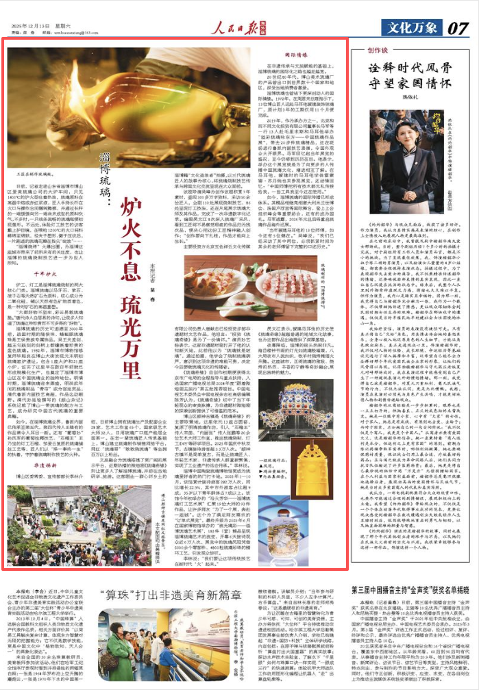 文旅融合为琉璃搭建了更广阔的展示平台,近期热播的微短剧《琉璃奇缘》则让更多人了解淄博琉璃,并前往当地研学、旅游。这部剧由一群心怀乡土的淄博籍“文化造浪者”拍摄,以三代琉璃匠人的故事为核心,将琉璃烧制技艺传承与跨国文化交流呈现在大众面前。