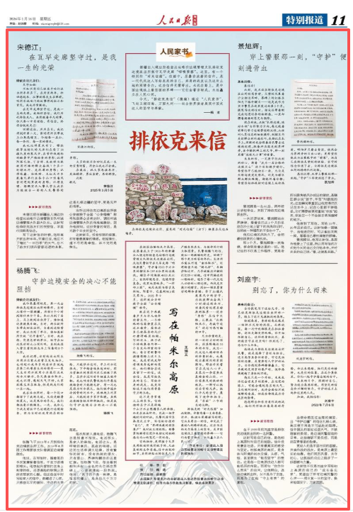 今天,“排依克来信”(摘编)通过“人民家书”,飞向五湖四海、万国九州……向全世界读者展现中国戍边人的坚守与奉献。