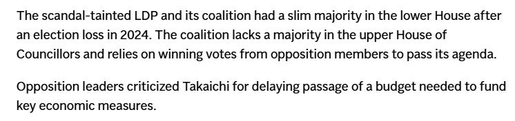 日本共同社英文网的报道援引政治分析师的话称,高市担心,一旦国会开始辩论,其支持率会下降,尤其是考虑到反对党预计将会就一些长期存在的丑闻向政府施压。