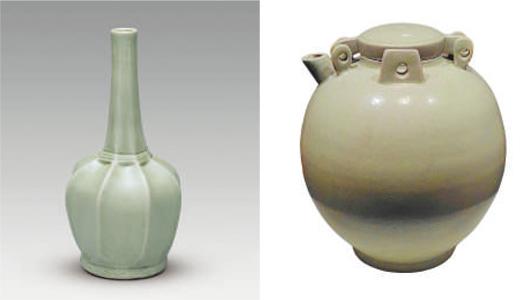 陕西法门寺地宫出土的秘色瓷净瓶(左)、浙江钱鏐墓出土秘色瓷夹耳罐。