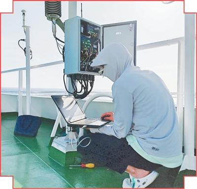许峰铭在调试船舶站的气象设备。受访者供图