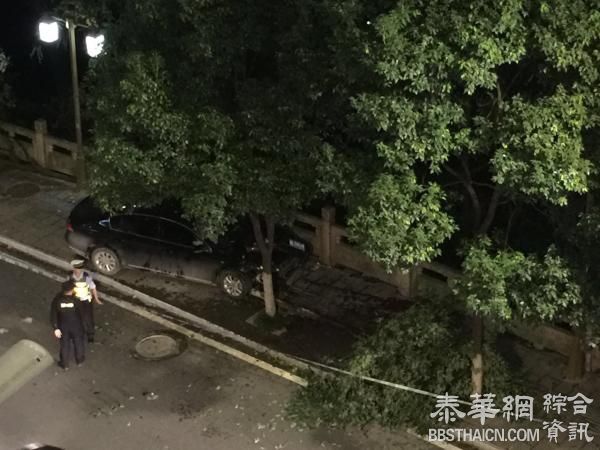 报道还称,肇事车辆是一辆黑色大众迈腾车,撞击后车头右边已经严重损坏,引擎盖上翘,轮胎干瘪。肇事车辆前后还有两棵断掉的行道树。
