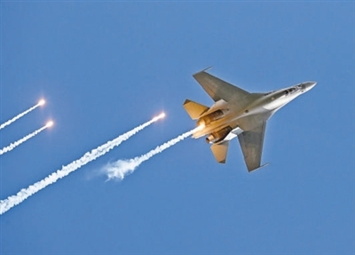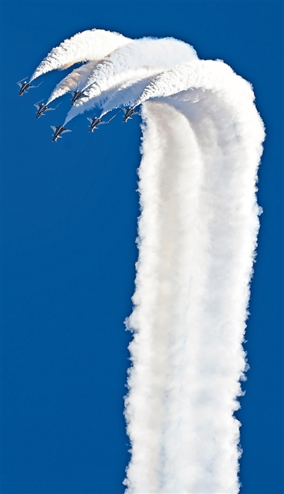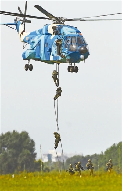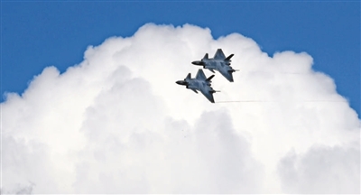 歼—20双机空中展示。 空降兵空中突击分队进行反恐营救行动演示。 歼—16战机投放干扰弹。 空军“八...