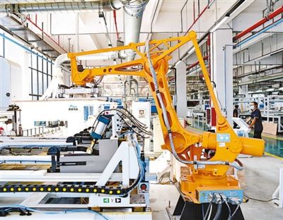 近日,江西省赣州市南康区家具零部件共享配料制作中心,工人在数字化生产线导入编程代码,遥控操作机械臂、...
