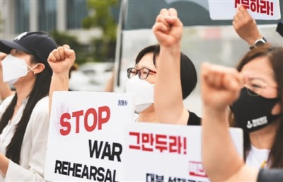 八月二十二日,集会者手持标语牌在韩国首尔参加集会反对韩美军演。新华社记者 王益亮摄 近期,从东南亚印...