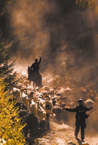 新疆阿勒泰地区福海县边境管理大队抽调民警成立护牧分队,助力当地牧民转场。 张家旭摄(影像中国) 内...