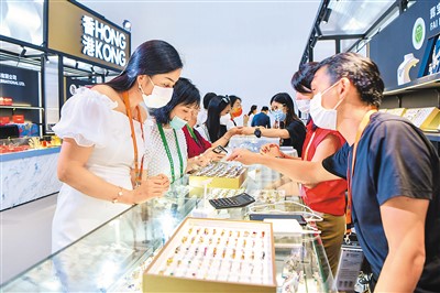 参观者在香港馆咨询商品。 众多参观者在香港馆排队品尝香港特色小吃。 第二届中国国际消费品博览会近日在...