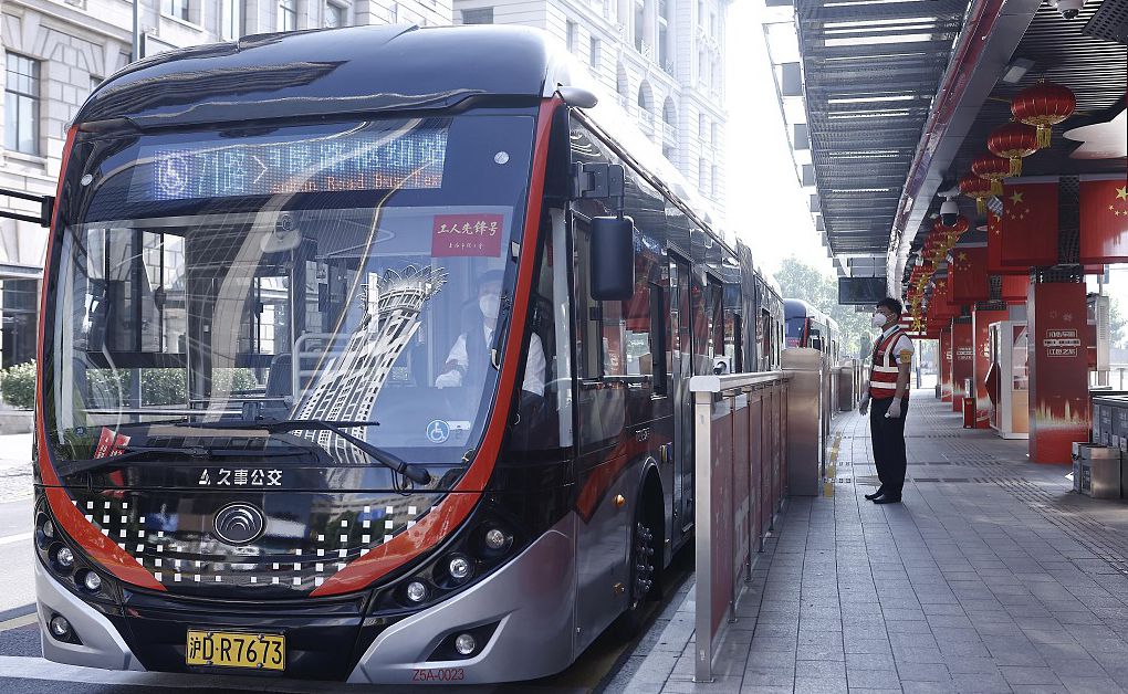 2022年5月22日,上海,一辆公交车驶出外滩站。当日,上海轨道交通四条地铁线路107座车站恢复运营...